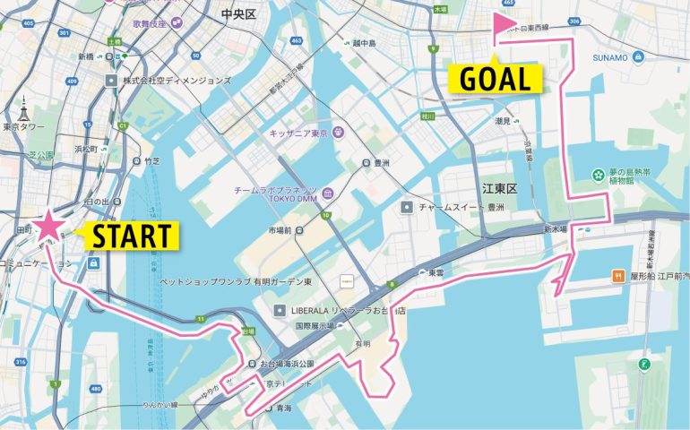 場所:湾岸エリア(田町→レインボーブリッジ→お台場→ビッグサイト→新木場→夢の島公園→東陽町)