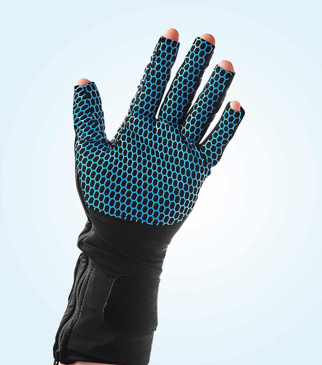 フィンガーキャプチャーグローブは、要はマシーンです。精密なセンサーが指先に数十個貼り着いており、手の甲には決して小さくない発信機が取り付けられているものが一般的です。