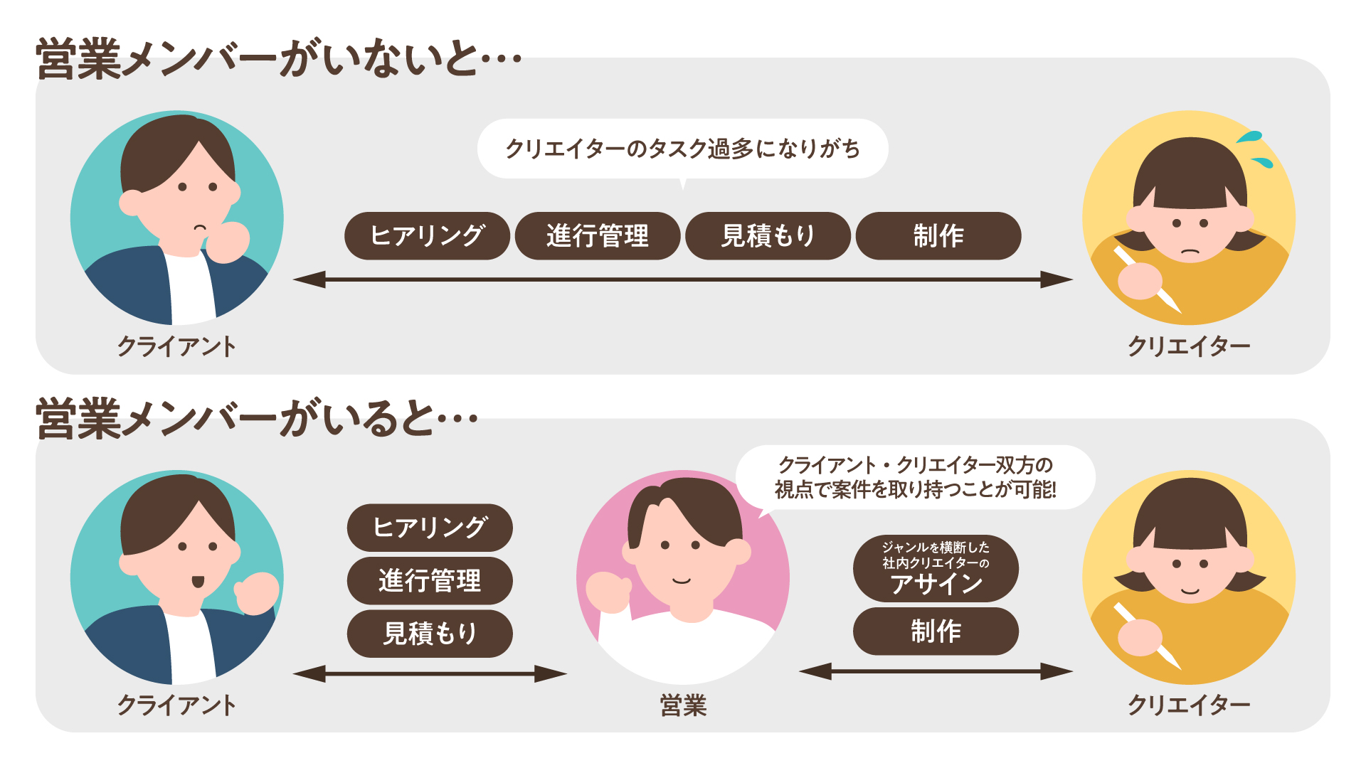 ——まさにそこがお聞きしたかったのですが、お客様の中には「直接ディレクターやデザイナーとやり取りした方が早いのでは」と考えている方もいらっしゃると思います。調整という役割以外に、営業が間に立つ意義について聞かせてください!